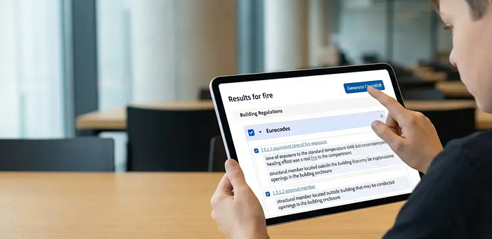Enter your project type or specific terms like "Fire Safety" or "Accessibility" to pull relevant regulations instantly.